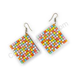 Wooden Drop Geometric Earrings - Diamond Stripes 4 (rectangular), Colorful